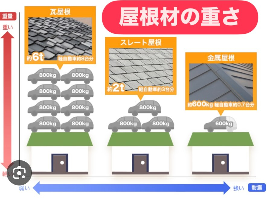 屋根の軽量化は推進されており、地震の際の揺れも軽い方が軽いと言われています。