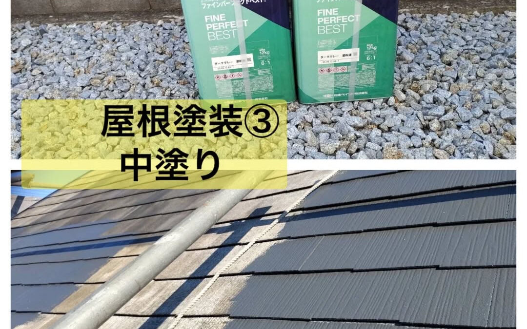 【屋根塗装③ 中塗り作業の様子】